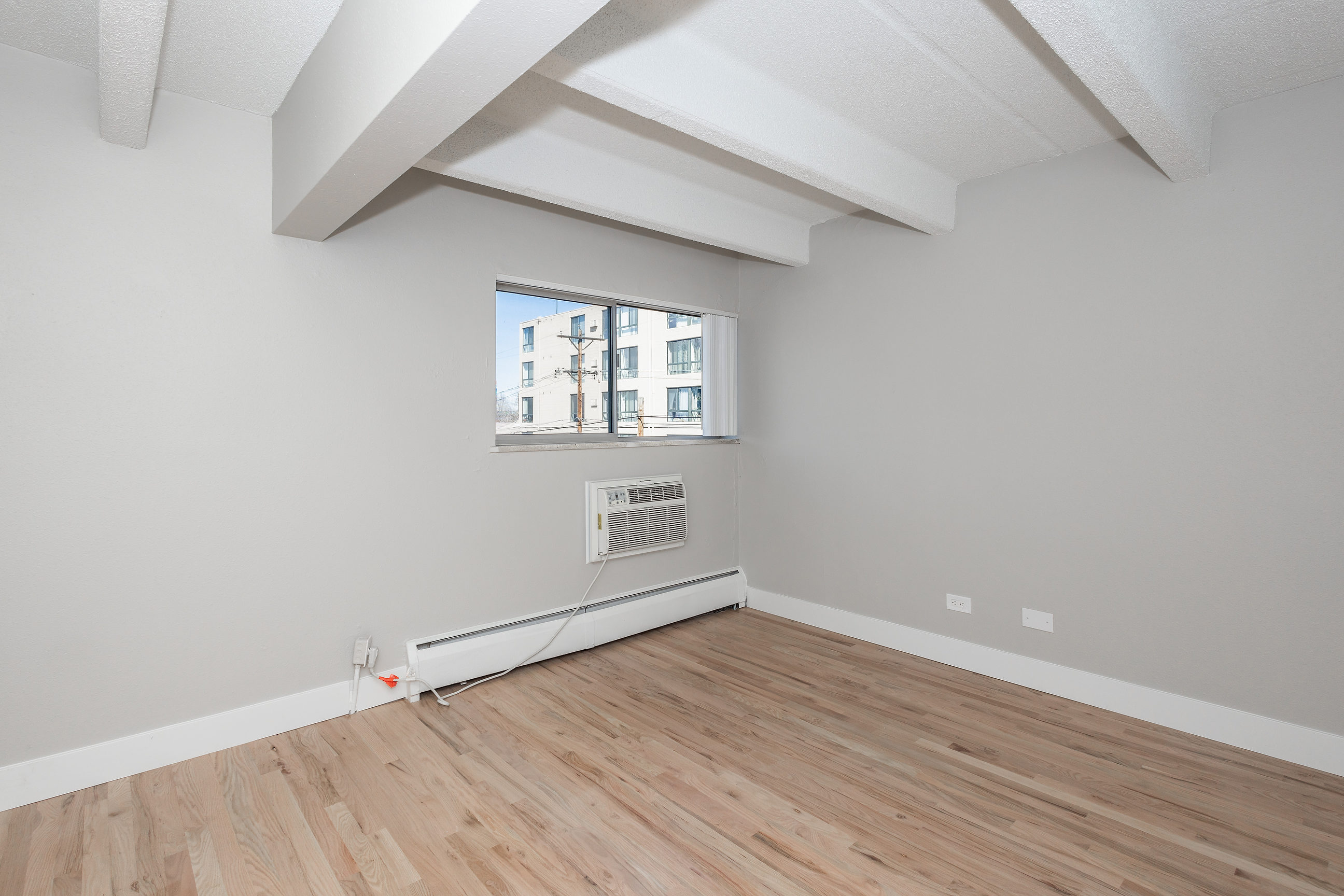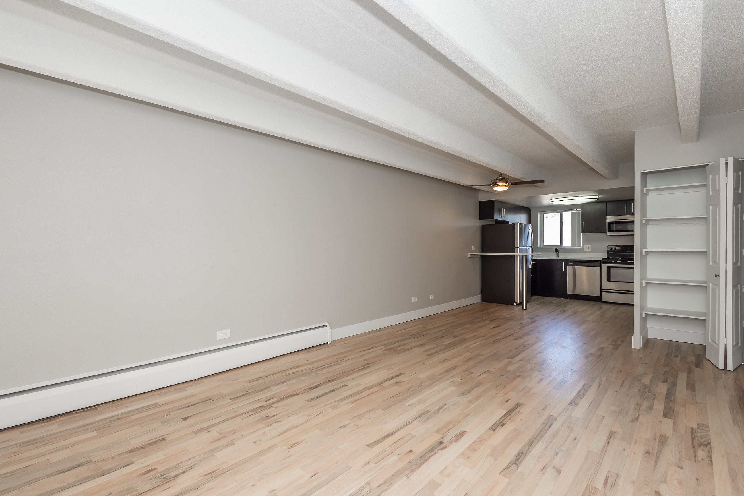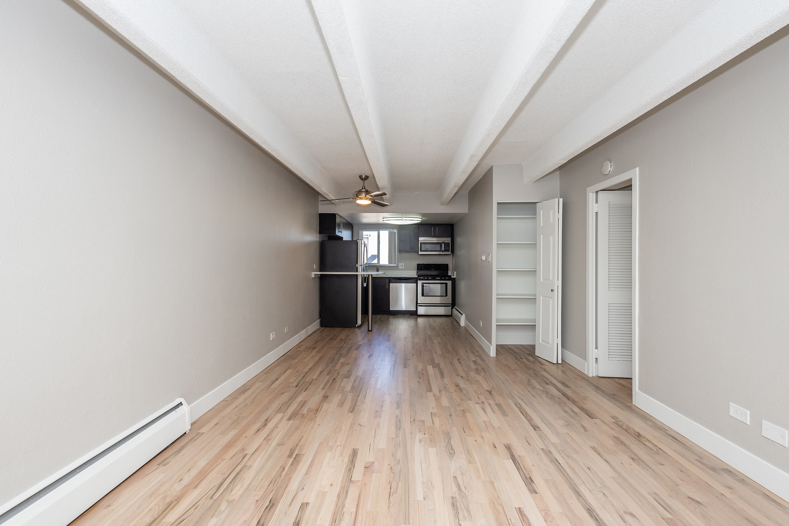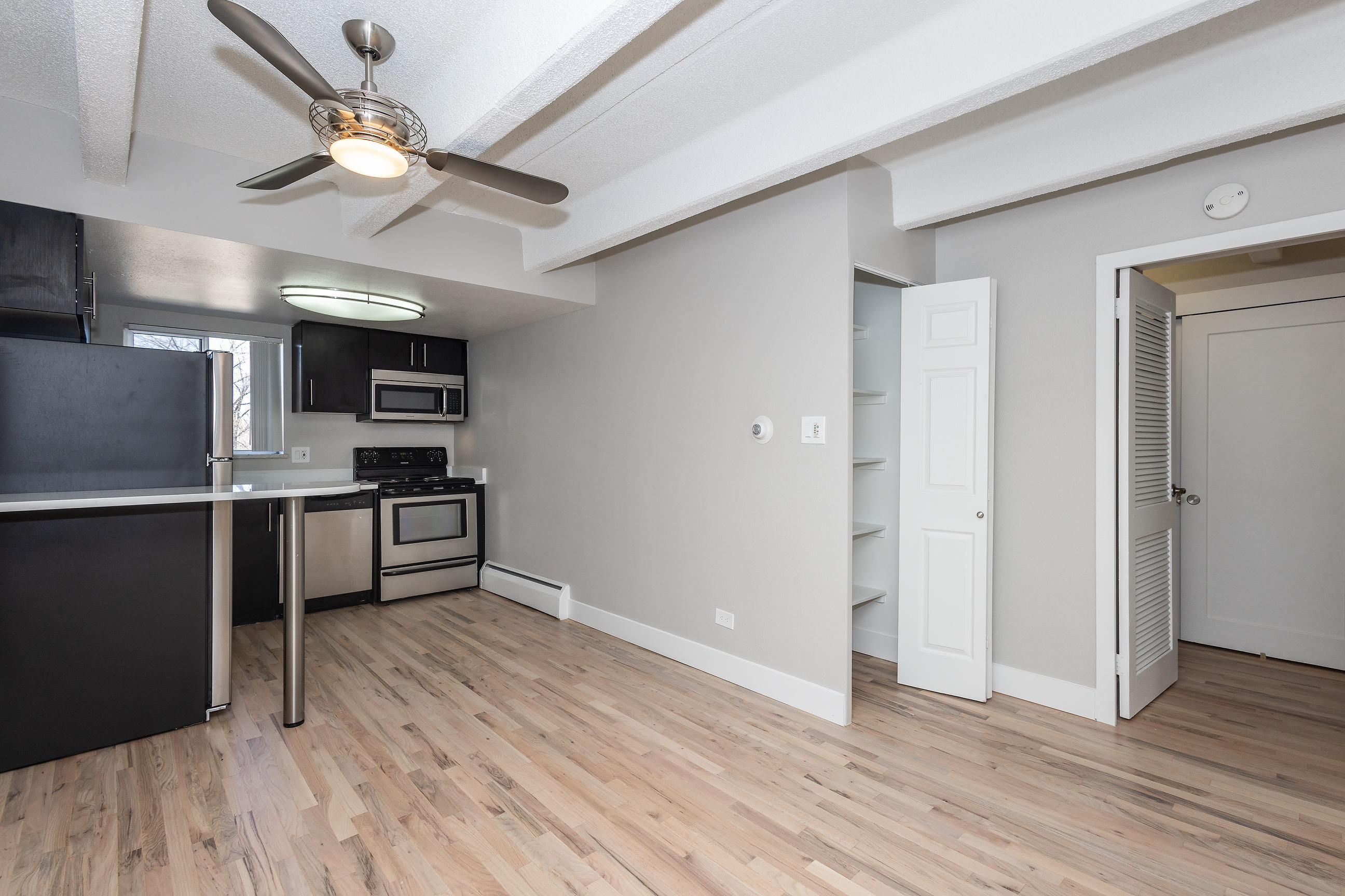 Enjoy a new courtyard and seating area decorated with a modern water feature that softens city sounds, a fire pit, fire place, and plenty of benches for hanging out with housemates at 1300 Apartments. These one, two, and three-bedroom apartments shine with hardwood floors, modern kitchens with stainless steel appliances, air-conditioning, and in-home laundry* and huge balconies in select apartments. Some units even have retro-style fireplaces! Building amenities include a fitness center, bike storage, Amazon lockers, and a rooftop deck. On the eastern edge of the Congress Park neighborhood, 1300 Apartments is convenient to restaurants, coffee shops, and nightlife such as Cerebral Brewing, Sienna Wine Bar, and Good Bread Denver.