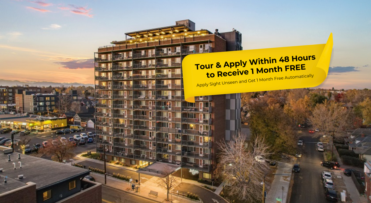 Appreciate an elevated Colorado lifestyle at Julian32 at Highlands Square -- an updated high-rise in an inviting part of town. Studio, one and two-bedroom apartments are equipped with modern appliances, open floor plans, and enormous private balconies. Common area amenities include a streamlined access control system, world-class high-speed internet access, secure indoor/outdoor bike storage, an expanded Clothing Care Facility with brand-new washers and dryers, a rooftop club room, state-of-the-art fitness studio with outdoor workout space and expansive rooftop deck boasting unparalleled city and mountain views. Located in the lively Old Highlands Square, Julian32 is right across the street from many local bars, restaurants, coffee shops, retail boutiques and yoga and fitness studios. PETS ARE NOW WELCOME!!