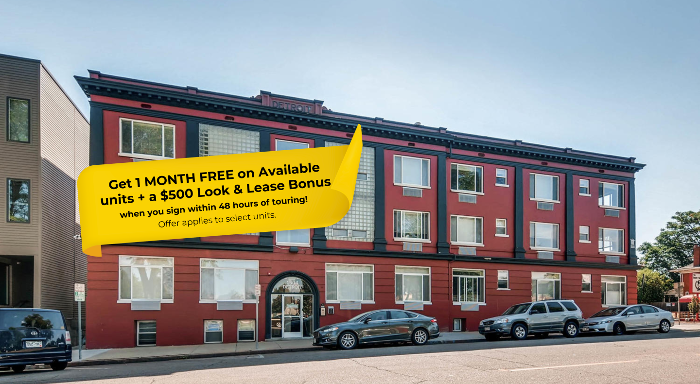 Welcome to The Detroit, a charming historic community in Denver's vibrant City Park neighborhood. Built in 1926, this pet-friendly property offers studios, 1- and 2-bedroom apartments designed to blend classic character with modern conveniences. Residences feature granite countertops*, dishwashers*, wood-style flooring*, carpeted bedrooms*, and ceiling fans* for comfortable, stylish living. Additional amenities include on-site storage units, providing practical solutions for city living. Experience the perfect mix of timeless architecture and contemporary comfort at The Detroit.