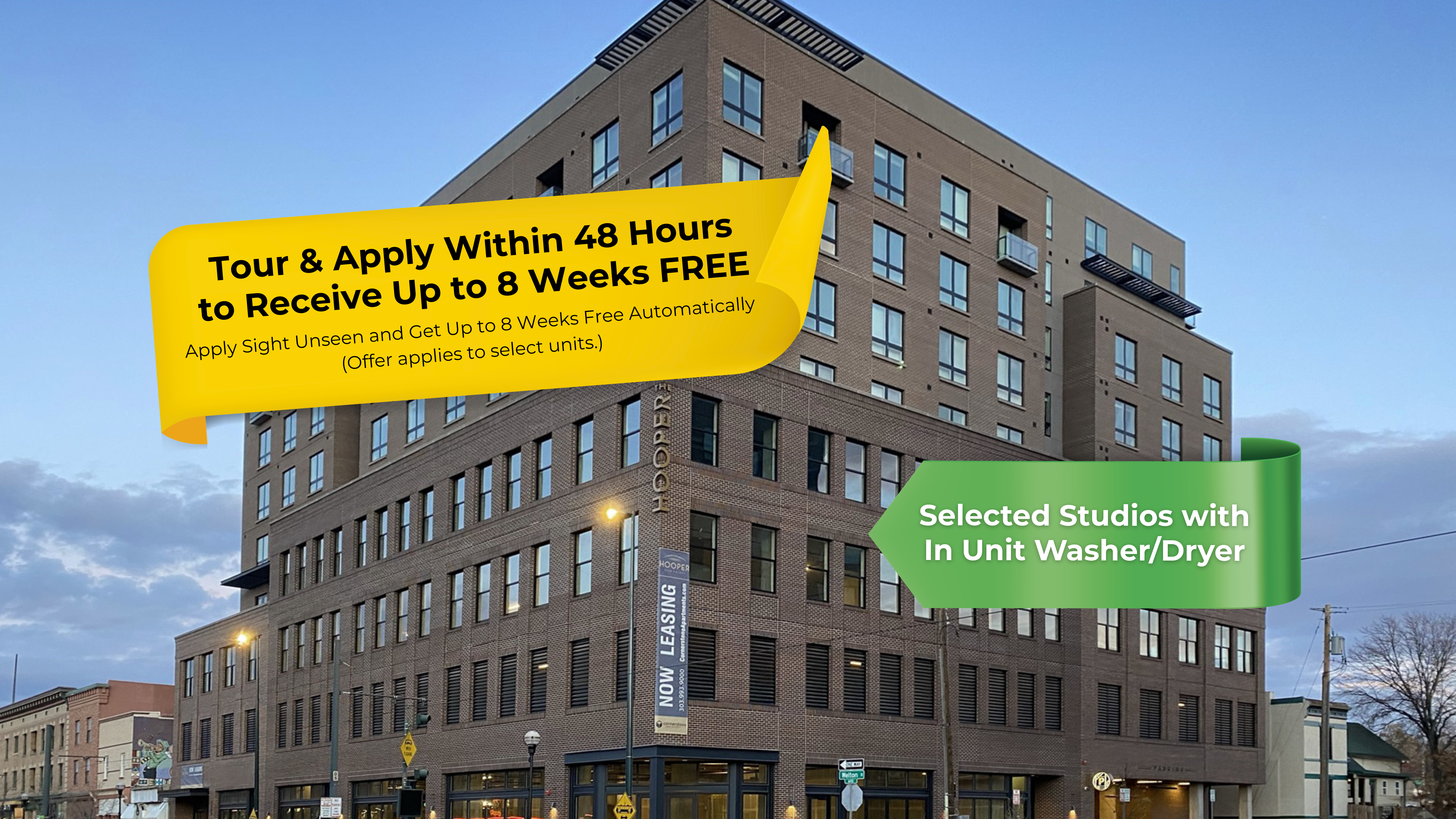 The Hooper, which opened its doors in 2021, is a nine-story multi-use, 103-unit apartment building. The building pays homage to Five Points' neighborhood business tycoon and legend, Benny Hooper. Several highlights of the property and neighborhood include:· Offering microunits and traditional studios, one, two, and three bedrooms· Modern finishes, wood-inspired flooring, and full-sized kitchen appliances· Balconies and an in-unit washer and dryer in select floor plans· Secured, covered parking including Electric Vehicle Charging Stations· Pet-friendly units· Common area amenities including fitness center, golf simulator, a top-floor viewing deck, a clubroom with a full kitchen, bike storage, plus on-site retail· Stunning views of the city and the mountains· Steps away from the 25th and Welton RTD Light Rail Station· Close proximity to many neighborhood bars and restaurants· Easy access to downtown and I-70{end_list}