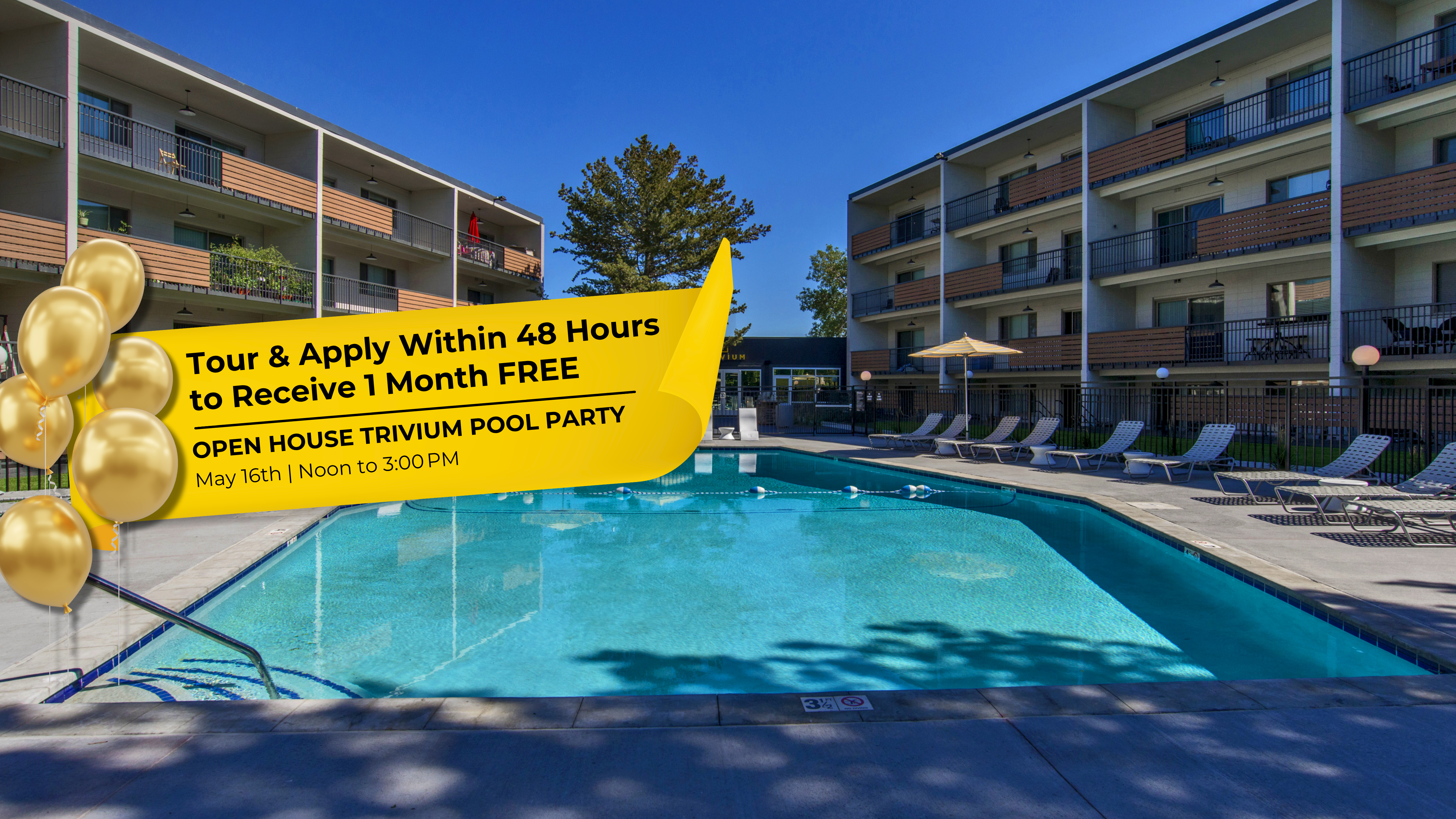 Splash Into Your New Home at Trivium Apartments. Join us for a pool party and apartment tours on May 16th Noon to 3pm! Also, Discover Your Next Apartment at the DU Housing Fair May 6 @ 11:00am - 1:30pm at the Community Commons Bridge!